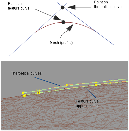 The output consists of a theoretical curve, and, if using the point method, a feature curve approximation. The feature curve attempts to lie on the mesh as much as possible. The theoretical curve is drawn where both sides of the mesh (across the feature curve) would intersect if they were extended. The theoretical curve generally lies off the mesh.
