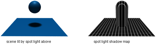 A spot light uses a shadow map (or depth map) to calculate the shadows cast by surfaces. If a surface is illuminated by a spot light, then the shadow map begins at the illuminated surface and extends away from the light. Any surface that lies within this shadow map will be in shadow.