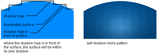 A problem may occur on illuminated, shadow casting surfaces. Because the shadow map has a fixed resolution, it may not be smooth enough to describe a surface. The shadow map may actually intersect the surface. This means that the illuminated surface will be partially within its own shadow. The result is a dark moire pattern on the surface.