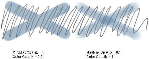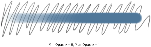 In addition, you can make the brush opacity change based on how hard you press the stylus on your tablet. The Min Opacity is the minimum opacity for the brush (when you press lightly with the stylus) and the Max Opacity is the maximum opacity for the brush (when you press hard with the stylus). If you do not want the opacity to vary with stylus pressure on the tablet, set the Min Opacity and the Max Opacity to the same value.