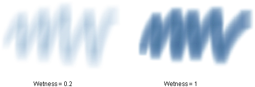 If the Wetness is high (for example, 0.9), paint will be applied to the canvas plane more rapidly than if the Wetness is low (for example, 0.1). You can therefore create different types of strokes with a marker simply by moving the stylus faster or slower.