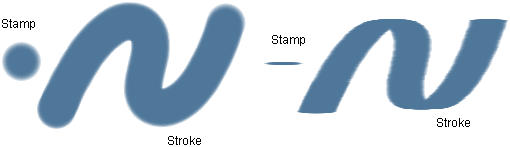 Brushes apply paint to a canvas plane in strokes. A stroke consists of a series of closely spaced stamps. (If you click a brush onto a canvas plane, instead of dragging the stylus, you will apply a single stamp of paint.)