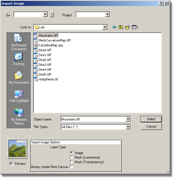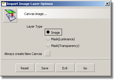 If Always create New Canvas was on, a new canvas plane is created and the image is loaded onto it as a mask layer (filling the entire canvas plane). The size of the canvas plane is based on the size of the current view window.