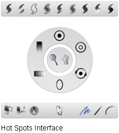 Pressing a pre-assigned key on the Cintiq (or the Space bar on the keyboard) invokes a hot spots interface on the Cintiq screen, which is a collection of icons, each referencing a specific tool.