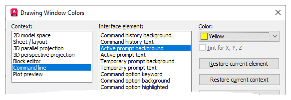 In the Drawing Window Colors dialog box, under Context, choose Command Line.