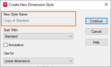 Note: When you select a specific dimension type, the New Style Name text box is disabled since it is a substyle of the selected dimension style you started with.