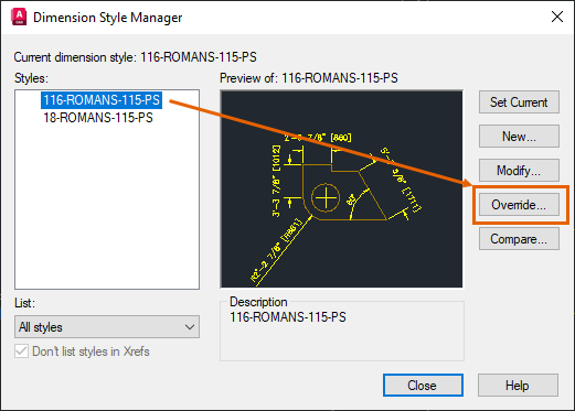 The settings that were overrides are now the default settings for the 116-ROMANS-115-PS dimension style.