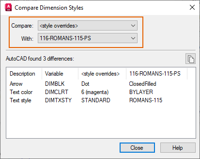 Note: You can use Compare to see the differences between any two dimension styles. Simply select the dimension styles from the drop-down lists that you want to compare.