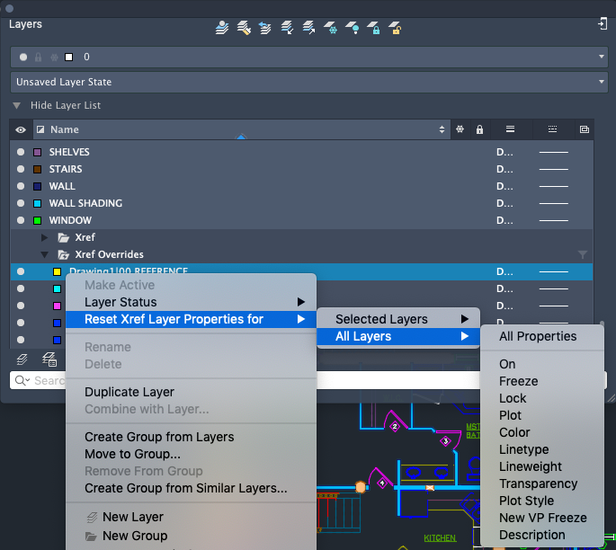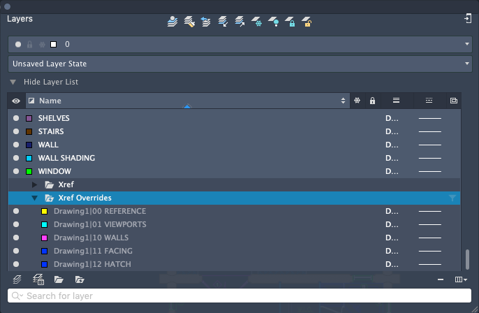 To aide in identifying Xref layers with overrides, a new Xref Overrides layer filter is available. Simply select the Xref Overrides filter to see a list of all the Xref layers in the drawing with applied overrides.