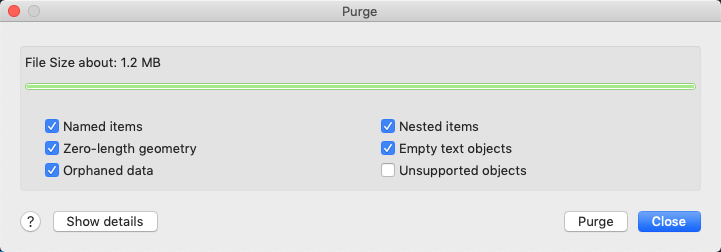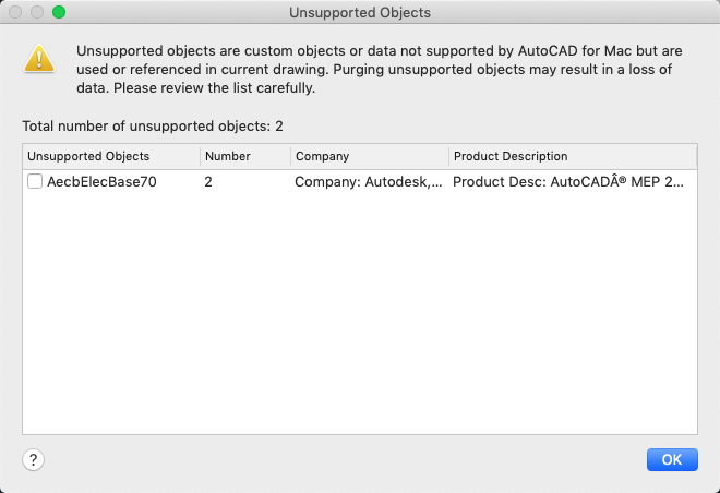 Unsupported objects are custom objects or data not supported by AutoCAD for Mac. If you selected Unsupported Objects, the Unsupported Objects dialog box displays after you click Purge. Select the objects from the list that you want to purge. Purging unsupported objects may result in a loss of data. Please review the list of unsupported objects carefully.
