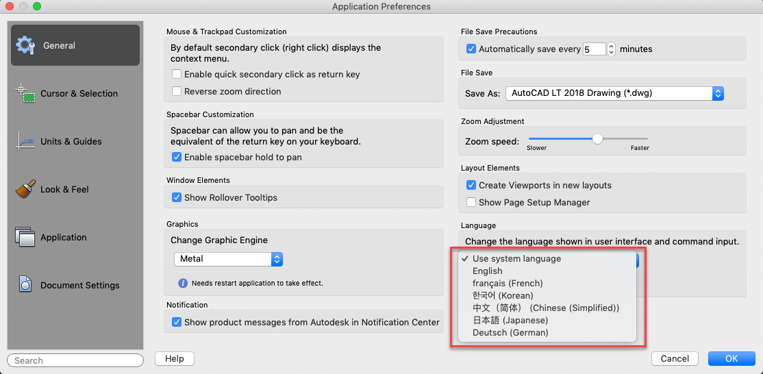 AutoCAD LT for Mac now supports German and Japanese. You can change the language in the Application Preferences dialog. Restart AutoCAD LT for Mac to see the language change.