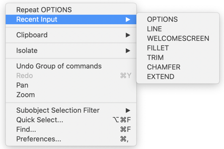Repeat commands or command input using Recent Input on the shortcut menu. Right-click to display a shortcut menu.
