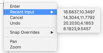 Recent Input is now available on the shortcut menu. If no command is active, the Recent Input menu contains the recent commands. If a command is active, the menu contains recent coordinates.