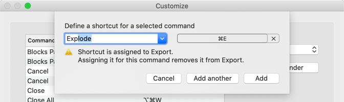 If a shortcut key is assigned to another command, an alert displays so you can decide whether to reassign the shortcut key or select different shortcut keys.