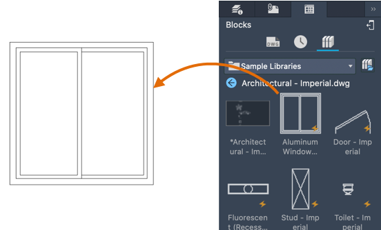 - From the Blocks palette, double-click to place the block, or drag to place it. When you double-click to place the block you can use object snaps for more precision.