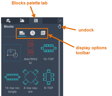 Displays recently inserted or created blocks. The recent list persists across drawings and sessions.