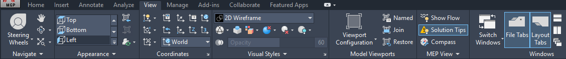 - MEP View. Provides tools to see the flow direction of ducts and pipes, a command to display broken connections (solution tips), and a way to adjust the compass settings. The expanded tab provides a way to hide the compass bar, and a tool for controlling the size of solution tips.