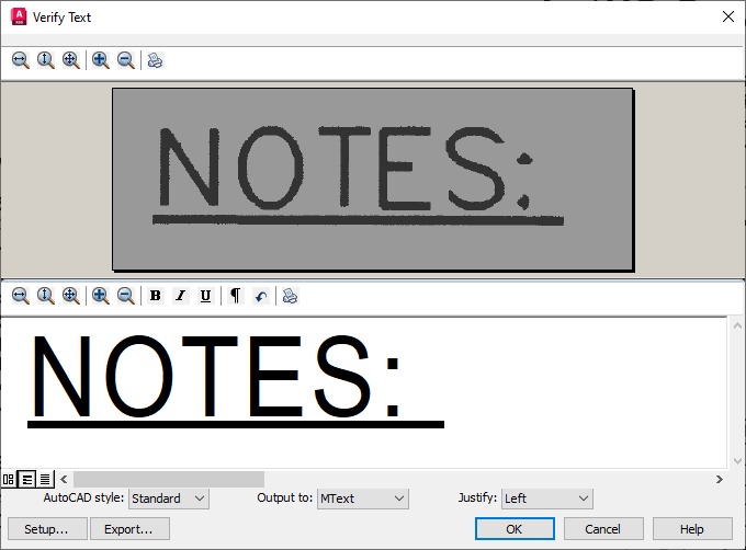 Verify Text window displays the word NOTES: in both the View pane (upper pane) and the Edit pane (lower pane). If the word NOTES: is not underlined in the Edit pane, click and drag to select the word and click the underline formatting option on the Edit toolbar. If the recognition engine has inserted any unwanted characters, delete them from the Edit pane.