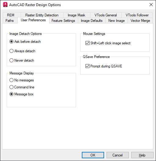 AutoCAD Raster Design Options dialog box has the following tabs. For more information about any of these settings, click the tab, then click Help.