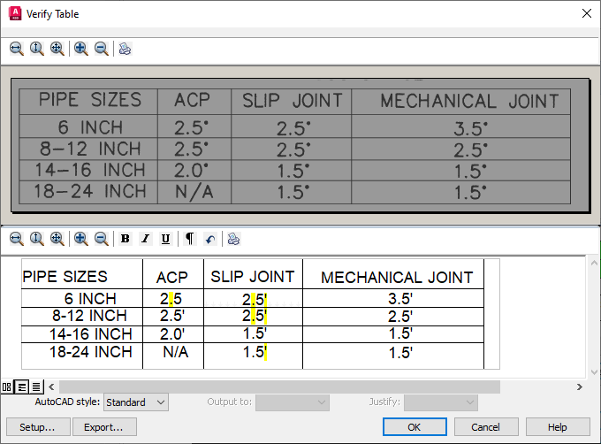 Verify Table window. In this example you would change the $ characters in the first column to the numeral 8 and correct the spacing for the word INCH.