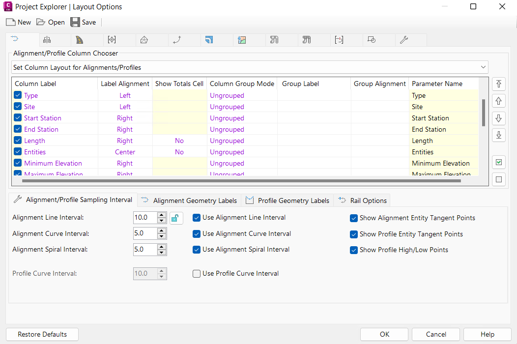 In addition to the standard column layout and labelling options, the Alignments tab in the Layout Options window provides a series of dedicated options for controlling the display and formatting of alignment and profile related station and entity data.