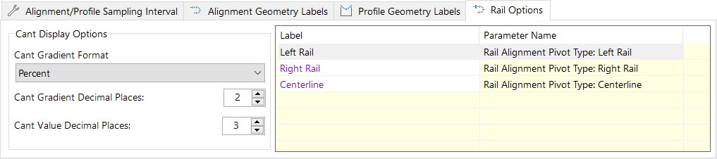 The Rail Options tab features Cant Display Options and a list label list. You can use the Cant Display Options box to control the Cant Gradient value in Cant Curves tab. The label list allows you to edit the name of rail labels in the drawing. After editing a label in the Rail Options dialog, labels in the Project Explorer main window, Alignments tab, Calculated Stations list, and Rail Pivot Type are updated.