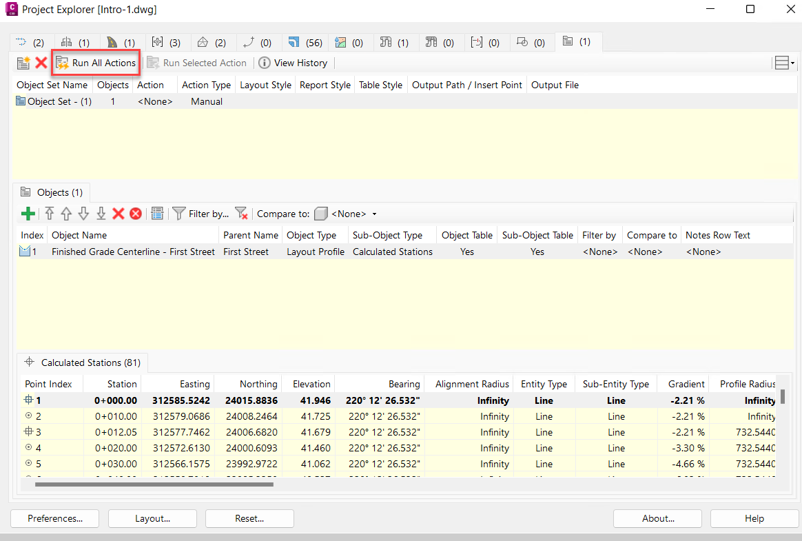 | Dynamic | In this case, actions are triggered dynamically when any associated object is modified in the Civil 3D or Project Explorer windows. This action type is currently only Object Set Actions which generate AutoCAD Tables. |
