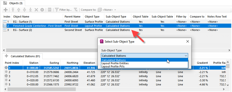 For some Civil 3D object types, there is a choice of available sub-object types for a listed Object Set Item. For example, for alignments it is possible to generate a report which includes calculated stations, alignment entities, alignment PIs, or superelevation critical stations.