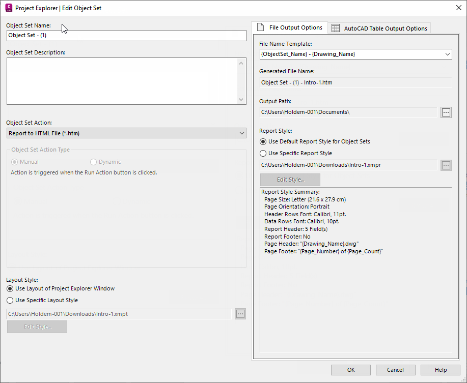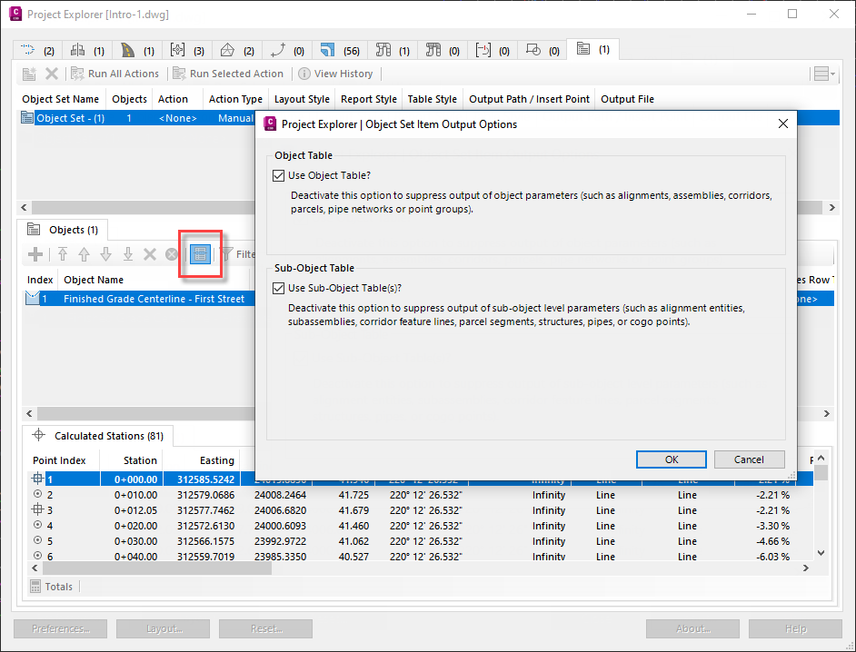 An Object Set is a user-definable list of Civil 3D objects, to which you can assign an action and other related details. Actions can be triggered manually or, in some cases, dynamically when Project Explorer detects that a dependent part your design has been modified. Object Sets are typically used to automate the production of pre-configured reports, spreadsheets, AutoCAD drawings, or AutoCAD tables, and the exact combination of styles, filters, and output instructions required depends on the type of action and object which is assigned.