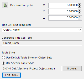Use this option to determine the location of the top left corner of the AutoCAD table or tables created by each Object Set. The location can either be specified by typing an XY coordinate into the window, or by picking a point in the AutoCAD viewport.
