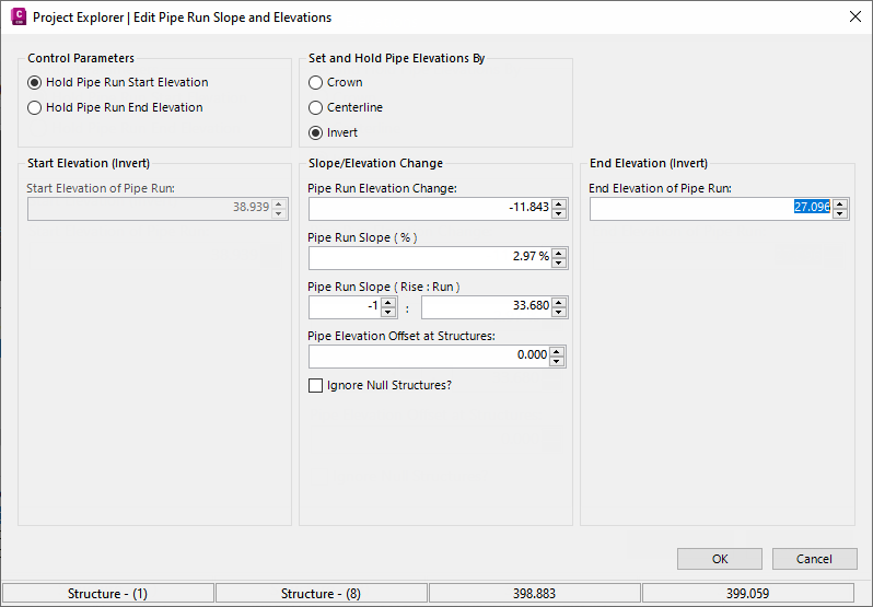 A new pipe slope value can be applied while holding the elevation of the start or end of the selected pipe run, and if there are any changes to the diameter of pipes in the current run you can elect to hold the invert, crown, or centerline elevations of pipes when crossing each structure. Pipe slope can be expressed in percent or run:rise, and an elevation offset can optionally be applied when crossing each structure in the pipe run.