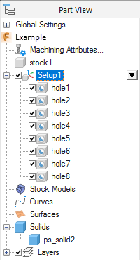 The Part view shows the eight holes that were created: