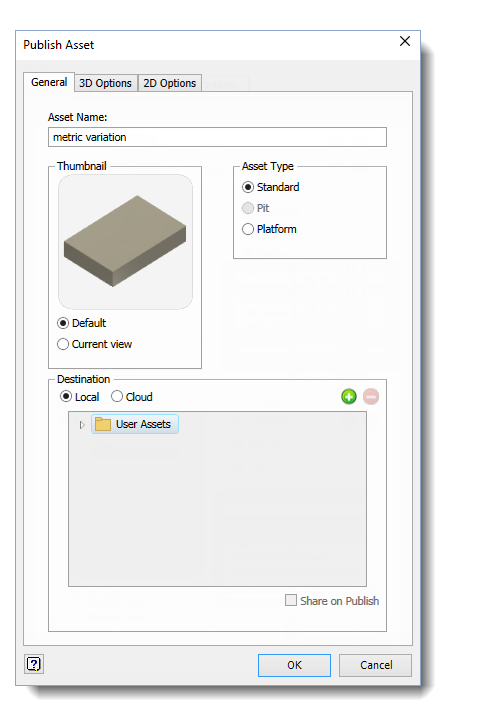 - Click the 2D Options tab and make sure that the Publish 2D Asset check box is enabled. This setting ensures that the asset gets published for use in AutoCAD Factory.