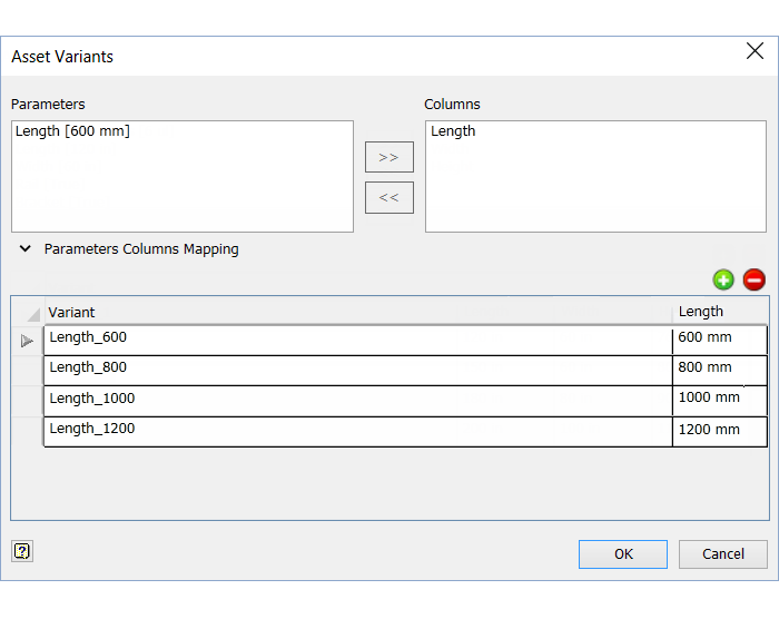 - Add three more variants and rename them Length_800, Length_1000, and Length_1200. Set their values in the Length column to 800 mm, 1000 mm, and 1200 mm, respectively.