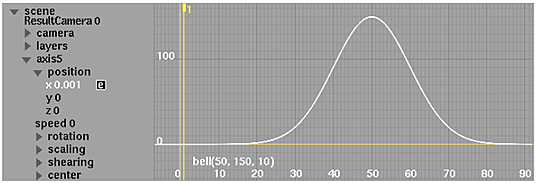 Returns a set of values representing a bell (normal distribution) curve over time. You can specify the centre frame number and height and width characteristics of the curve.