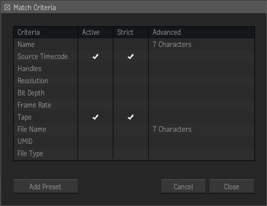 The Match Criteria window can remain open while tending to other parts of the Conform tab. This allows you to modify the Match Criteria and see the update live in the Conform list. Match Criteria are saved when the Close button is pressed and the Match Criteria that were selected when the dialog window was opened are restored when the Cancel button is pressed.