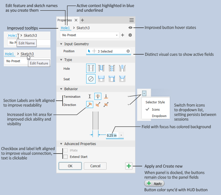 Various parts of the Inventor user interface underwent a refresh to update their display.