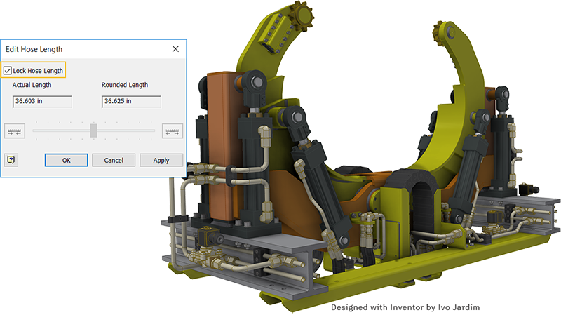 The new option, Lock Hose Length, allows you to calculate an exact sum of hose length. When selected, if components move or shift, this option prevents the length of the hose from changing due to adaptivity.