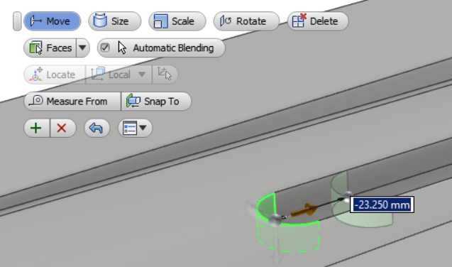 Direct Edit, you could only rotate or move a face feature to another location. When deselected, Automatic Blending maintains this behavior and moves a face to a new location. When selected, the total length of a face feature is modified.