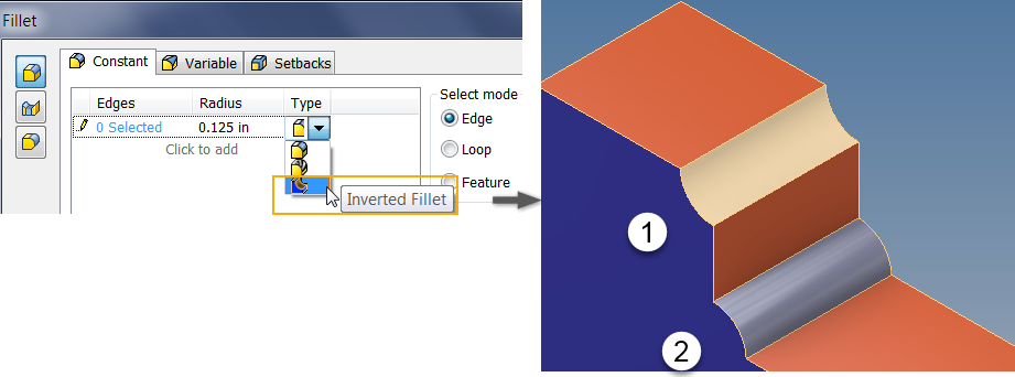 This new fillet option is the result of your feedback. You can create a fillet with 1) convex edges or 2) concave edges.