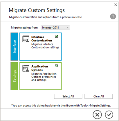 Use Migrate Custom Settings to bring your existing customization and Application Option settings into the latest Inventor Release. Administrators have additional control over use of this option in deployments.