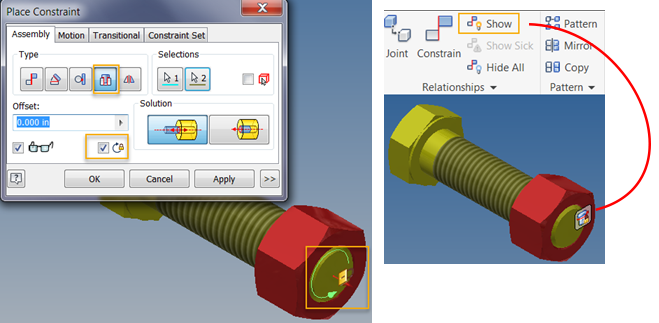 Use the new option, Lock Rotation, to lock the rotational degrees of freedom on a component when placing an insert constraint. This option prevents the part from rotating.