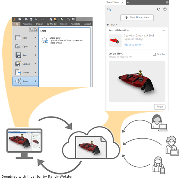 Shared Views provide a better way for designers, engineers, and visual artists to get feedback on their work in progress, simplifying and speeding up review cycles. Use Shared Views to share 2D or 3D views of your work online and see comments directly in the product you're working in. With shared views, any reviewer can review and comment online via the Autodesk Viewer. They avoid the need for stakeholders to install a specific viewer and provide powerful commenting and markup tools for conveying detailed feedback. Because shared views are visual representations that expire after 30 days, your native designs or models are always protected. This gives their authors a way of clearly separating unfinished work being shared for feedback purposes from more formal and permanent deliverables.