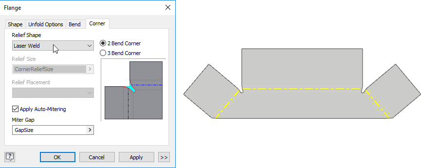 The Linear Weld corner relief terminates on a point, the Arc Weld corner relief shape terminates with a straight line segment. The new Laser Weld corner relief terminates with a tangent arc and is more suitable for laser cut parts.
