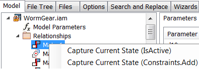 Step 2 In the assembly file, in the Edit Rule dialog box on the Model tab, multi-select the part names, right-click, and then select Capture.Current.State (Components Constraints.Add) from the context menu. |