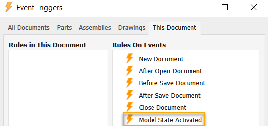 - There is a new event called Model State Activated now available in the Event Triggers dialog box. This trigger occurs when a model state is activated. Use this trigger to run a rule in the document in which the event occurred.