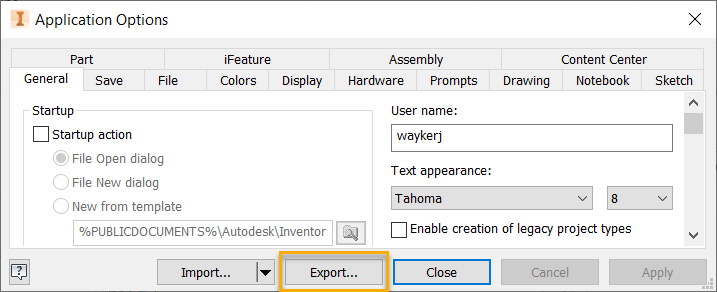 | In the Application Options dialog box, click Export. Export saves the current Application Options and the settings in the iLogic Configuration dialog box to an .xml file | When creating your deployment, select I would like to import custom settings, and enter the path to the exported .xml file |