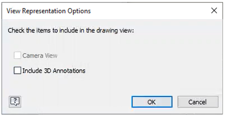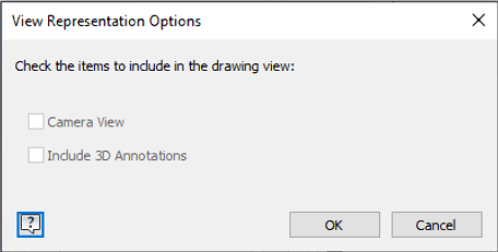 The View Representation Options dialog box is displayed when creating or editing a projected view. The Camera View option is disabled to keep the relationship between the base view and projected view.
