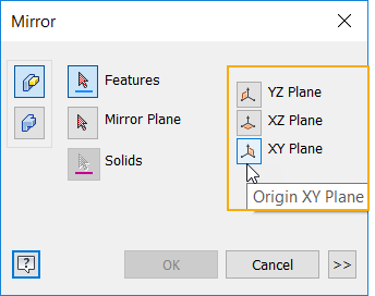 The workplane options in the part Mirror dialog box, available from the ribbon 3D Model tab