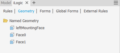 The assigned name displays in the Geometry tab in the iLogic browser and on the geometry in the graphics window (part file only).